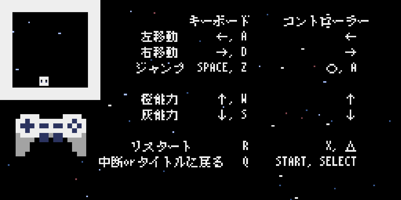 - ジャンプ不可 / 上下左右キーで自由移動可能